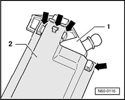 - Using a screw driver, unhook water channel - 1 - carefully on both sides at bearing on guide catch - 2 - and remove.