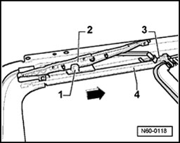 - Remove rear guide - 1 -, guide catch - 3 - and slotted guide rail - 2 - together out of guide rail - 4 -.