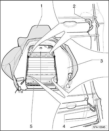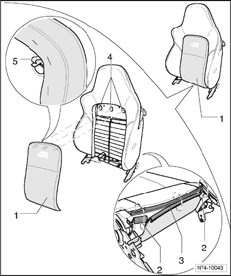 - Pull center part of backrest - 1 - out of three mounts in backrest frame - 4 - and disconnect harness connectors for seat heater.