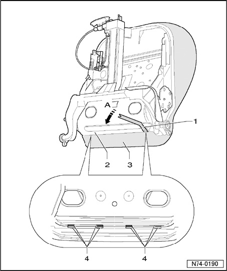 - Guide Pry lever 80 - 200 - 1 - between seat frame - 2 - and cover - 3 - and press apart locking lugs - 4 - - arrow A -.