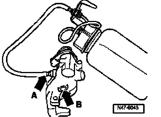 ^ Open bleed valve -arrow A- and using a standard bleeder bottle, with brake fluid until bubble-free brake fluid flows from the threaded hole -arrow B- (brake hose connection).