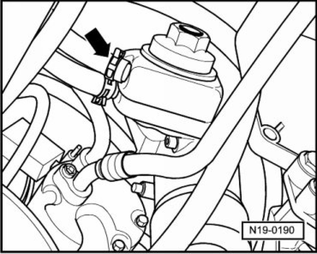 - Pull the coolant hose retaining clip -arrow- off, downward and remove the coolant hose from radiator.