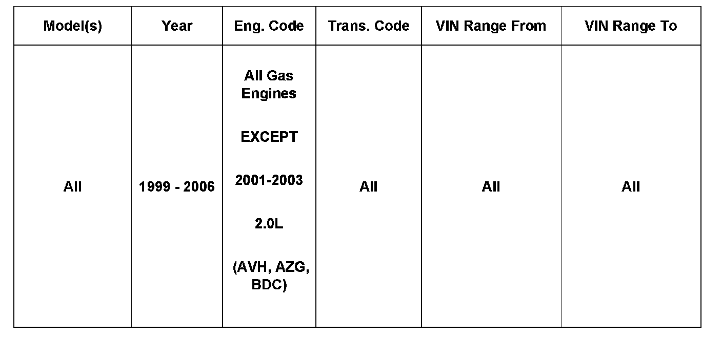 2010271 Supersedes T.B. Group 26 number 07 01 dated Feb. 9, 2007 due to the removal of 2001-2003 2.0L (AVH, AZG, BDC) engines.