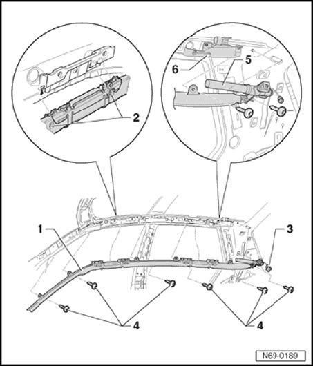 - Unscrew bolts - 4 - (qty. 6, 5 Nm) and pull out head-level airbag downward out of angle brackets (hold catch - 2 - and secure head-level airbag in angle brackets).