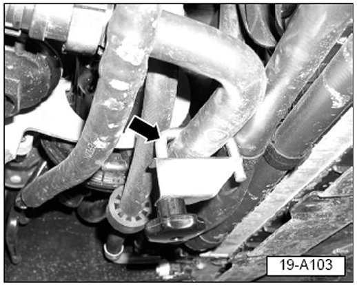 - Remove any lower radiator hose from retaining clip (arrow).