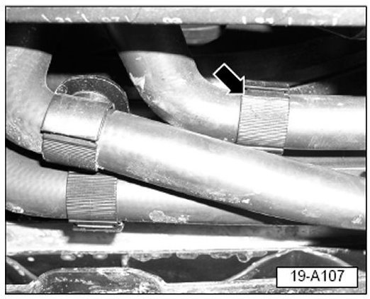 - Clamp off coolant hose at lower radiator hose (arrow).