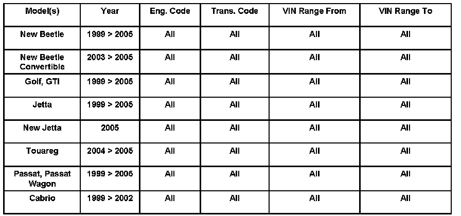 For Golf, GTI, Jetta, New Jetta, New Beetle, New Beetle Convertible, Passat, Passat Wagon and Touareg vehicles: