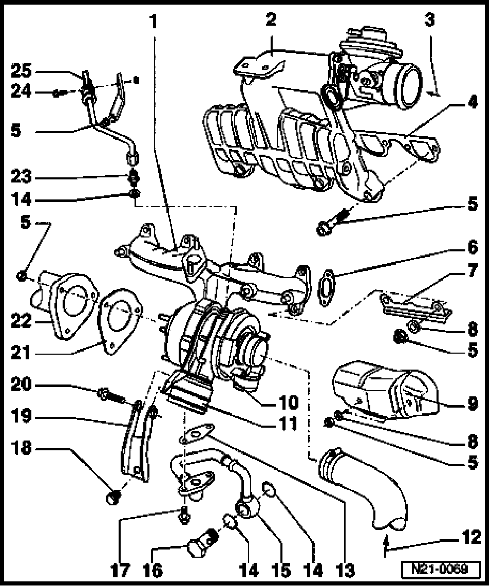 - After installing turbocharger, let engine idle for approx. 1 minute without increasing engine speed. This ensures adequate oil supply to the turbocharger.