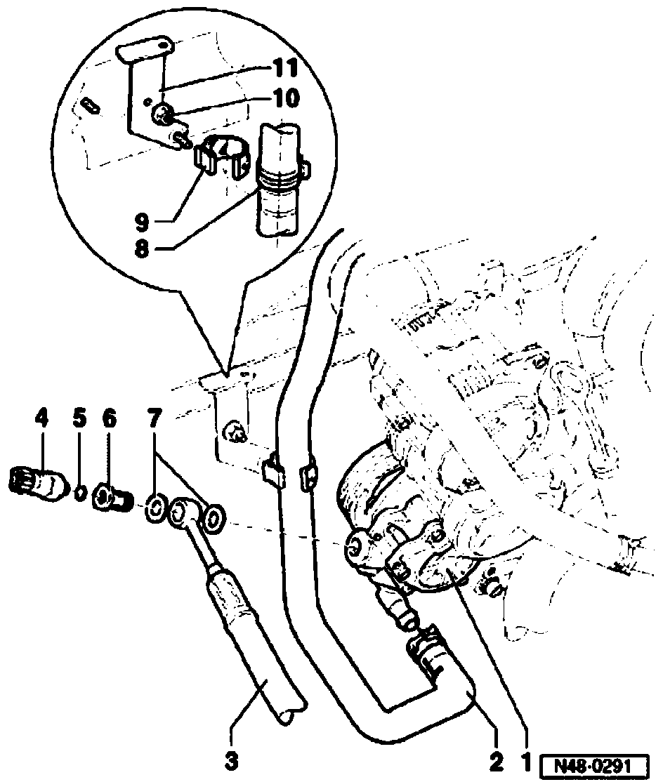 Securing pressure line and intake hose on vehicles with 1.9 ltr. TDI -engines without A/C