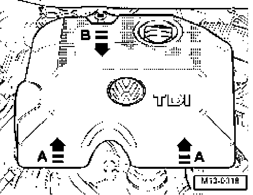 - Remove engine cover by pulling forward edge of engine cover abruptly upward - arrow - - and pulling forward out of rear securing clips - arrow B -