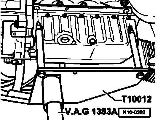 - Insert engine bracket T1 0012 in engine/transmission jack V.A.G1383A.