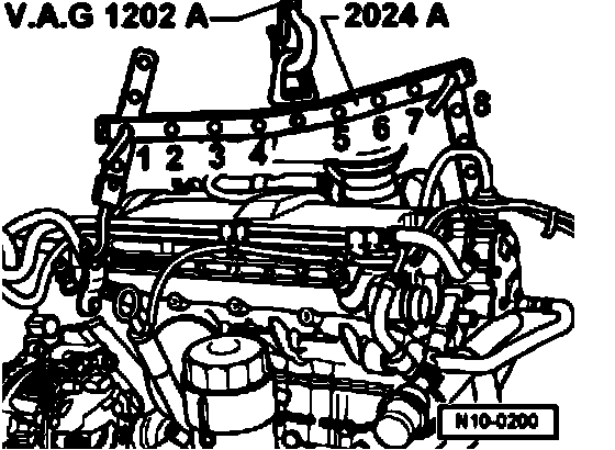 - Secure engine to support clamp VW313 using engine and transmission bracket VW540.