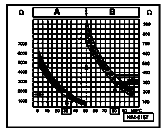 Range A displays resistance values for the temperature range of 0 to 50 degrees C, range B displays resistance values for the temperature range of 50 to 100 degrees C.