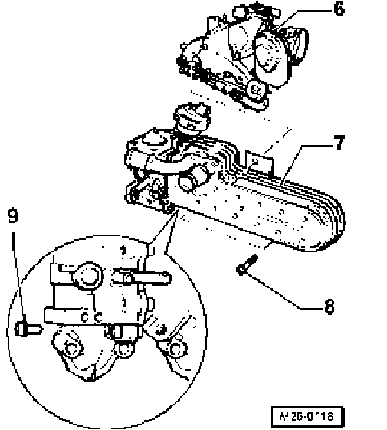 - Mount EGR cooler - 7 - to intake manifold - 6 - with 3 bolts - 8 - tightened by hand (EGR cooler must make contact and must be able to move within bolt holes).