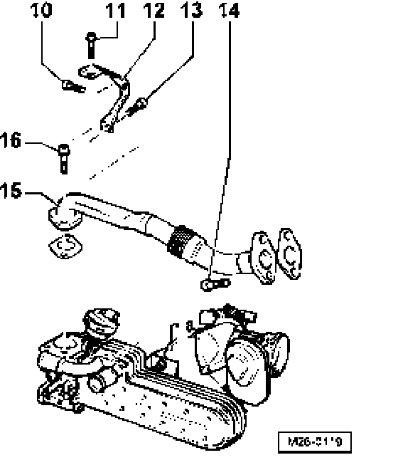 - Install connecting pipe - 15 - with seal, two bolts - 14 - and bolt - 16 - hand tight.