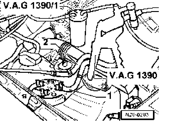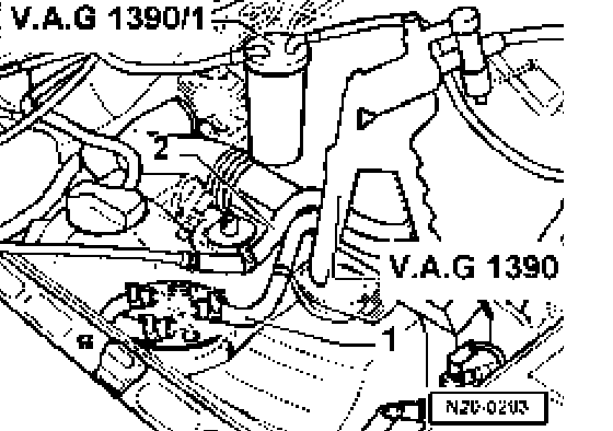 - Connect hand vacuum pump V.A.G. 1390 with bleed container V.A.G. 1390/1 to return hose - 2 - (blue marking) of fuel filter.