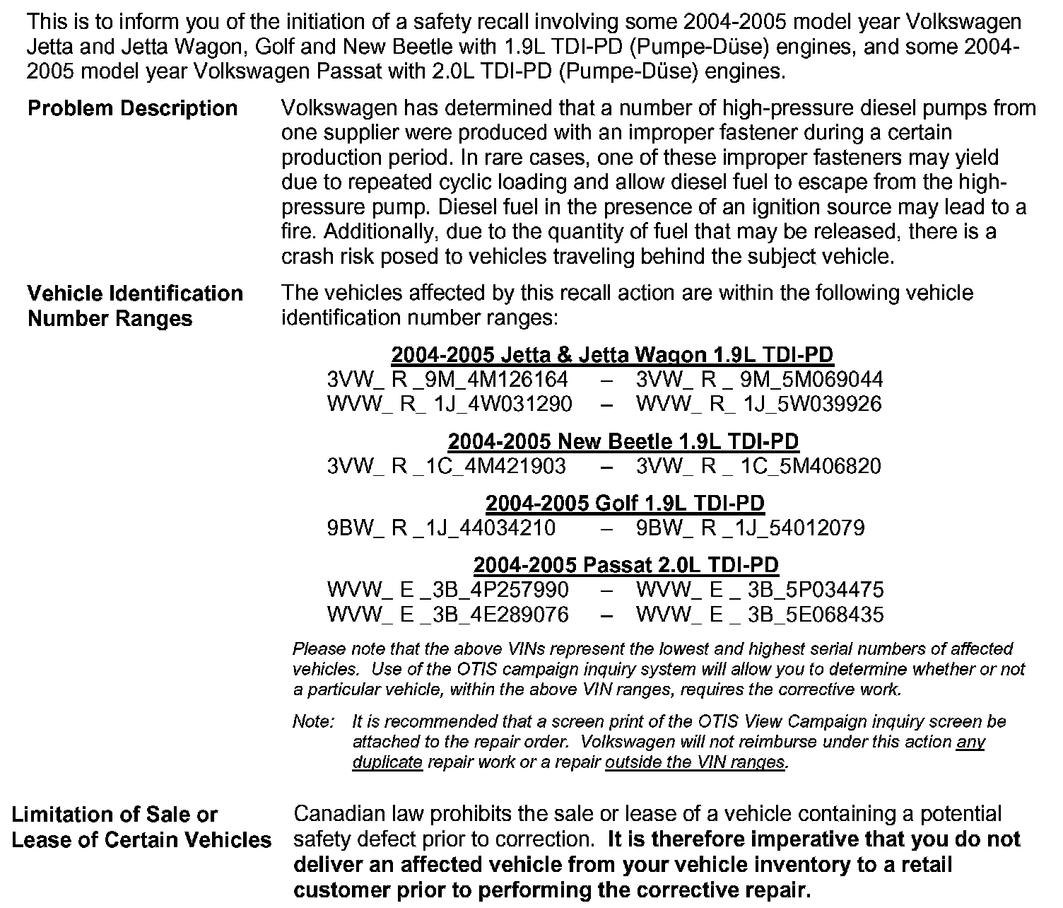 VY-CANSubject: 2004-2005 Model Year Volkswagen Jetta and Jetta Wagon, Golf and New Beetle with 1.9L TDI-PD (Pumpe-D�se) Engine 2004-2005 Model Year Volkswagen Passat with 2.0L TDI-PD (Pumpe-D�se) Engine Check/Install Diesel Pump Kit