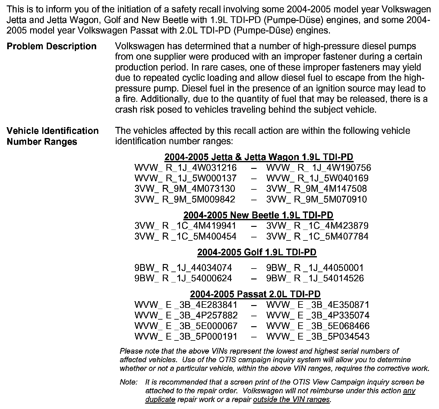 VY-USSubject: 2004-2005 Model Year Volkswagen Jetta and Jetta Wagon, Golf and New Beetle with 1.9L TDI-PD (Pumpe-D�se) Engine 2004-2005 Model Year Volkswagen Passat with 2.0L TDI-PD (Pumpe-D�se) Engine Check/Install Diesel Pump Kit
