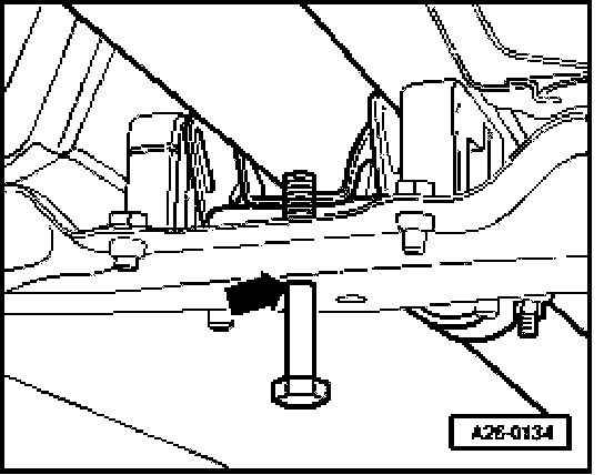 - Slide exhaust system as far in the direction of travel until the manufactured special tool can be inserted vertically through rear hole of tunnel bridge (arrow).