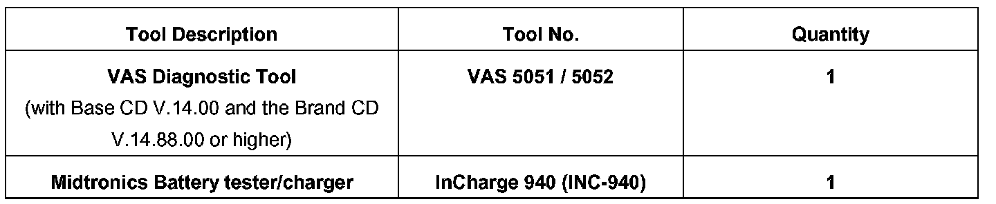 Battery MUST have minimum no-load charge of 12.5V (failure to maintain voltage during update process can lead to ECM failure) (use an Volkswagen approved Midtronics/InCharge 940 (INC-940) tester/charger to maintain battery voltage).