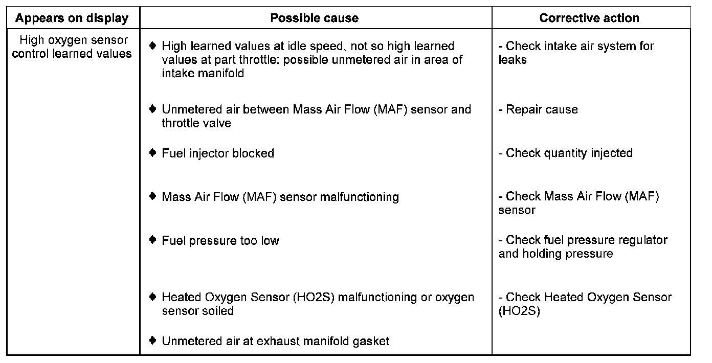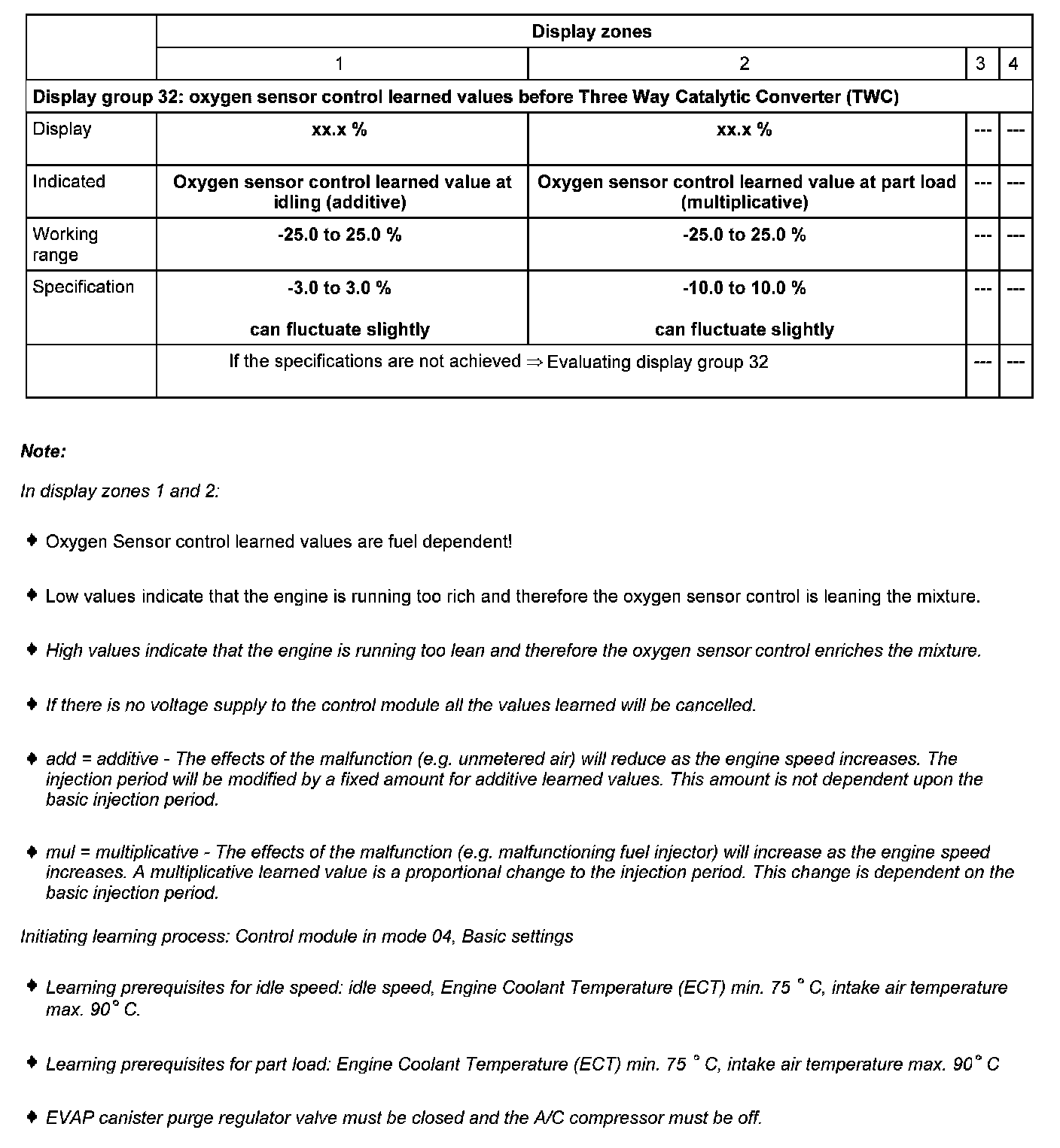 - Check oxygen sensor control learned values at part load (multiplicative) in display zone 2.