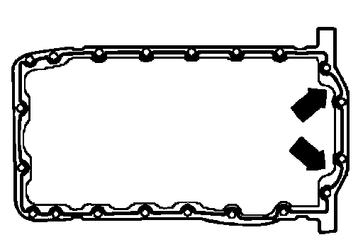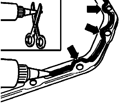 ^ Apply silicone sealing compound, as shown, to clean oil pan sealing surface. Sealant bead must be: