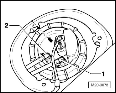 • After installation, check fuel delivery unit to make sure the fuel supply line - 2 - and the fuel return line - 1 - are still clipped onto fuel tank.