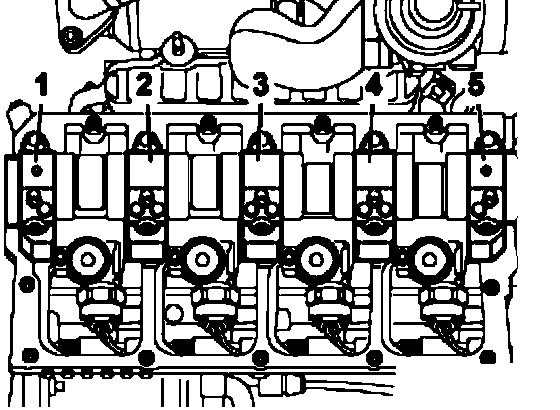 Install bearing caps 5, 1 and 3 and also tighten new screws to: 8 Nm plus an additional 1/4 turn (90°)