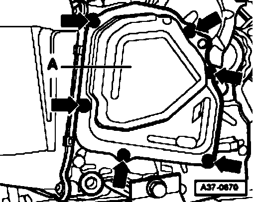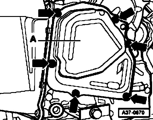- Install new gear oil pump cover -A- and tighten new bolts to (arrows) to 8 Nm.