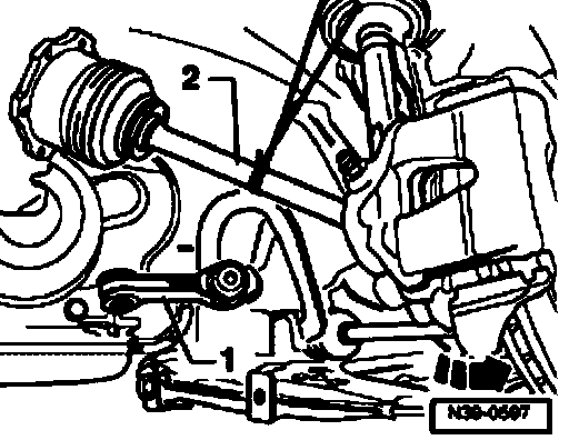 - Disconnect left coupling rod -1- from control arm and turn coupling rods upward.