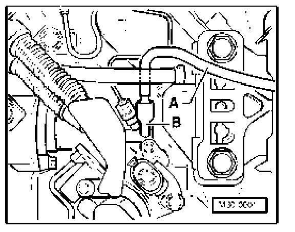 - Install bleed bottle bleed hose -A- onto bleed screw of slave cylinder - B- and open bleed screw.