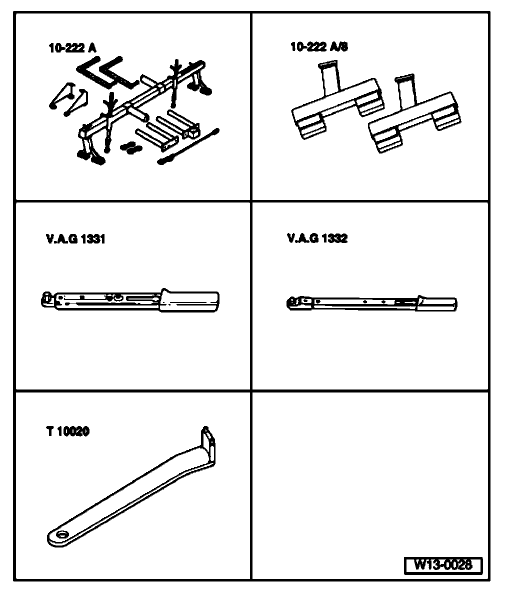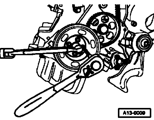 ^ Before tensioning toothed belt, turn tensioning roller on eccentric with pin wrench T10020 five times fully onto limit stops in both directions.