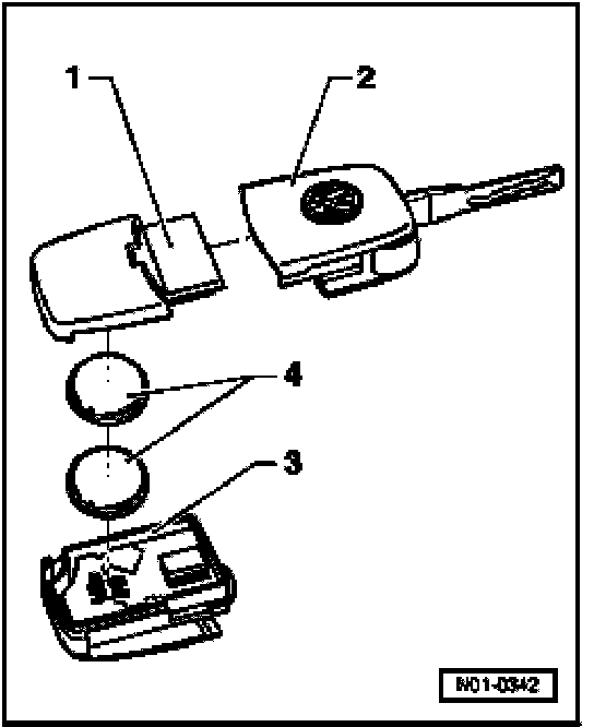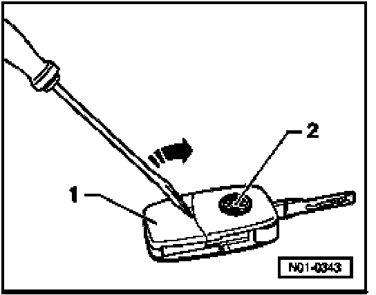 - Insert a screwdriver in the slot between the transmitter unit -1- and the main key -2-.