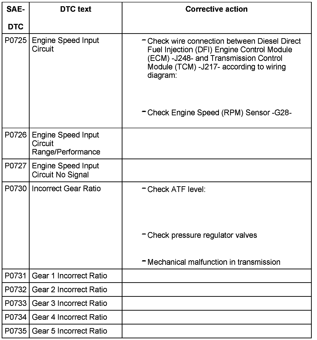 DTC P0725 - P0735: