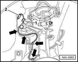 - Disconnect ABS wheel speed sensor wiring from retainers - arrows -.