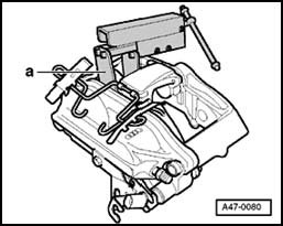 ^ Only one piston at a time can be forced out. When doing this hold the other piston in the caliper using the piston resetting tool - b -.