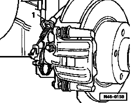 ^ Pull out securing clip -1- and unhook parking brake cable from brake caliper.