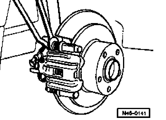 ^ Remove brake caliper housing and secure with wire so that the weight of the brake caliper does not stress or damage the brake hose.