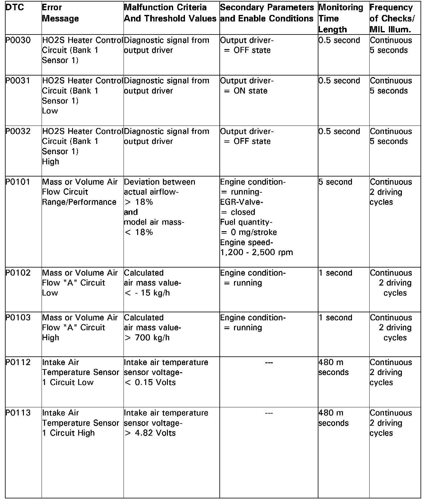 .02.00.00 OBD DTC SUMMARY TABLEDTC P0030 - P0113: