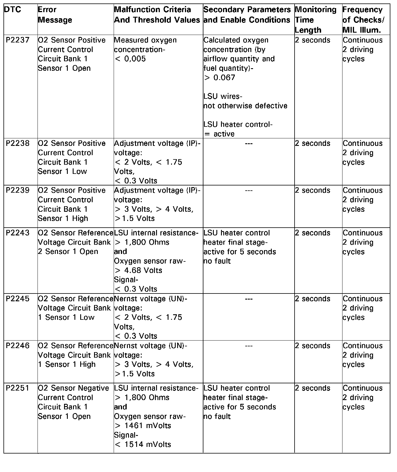 DTC P2237 - P2251: