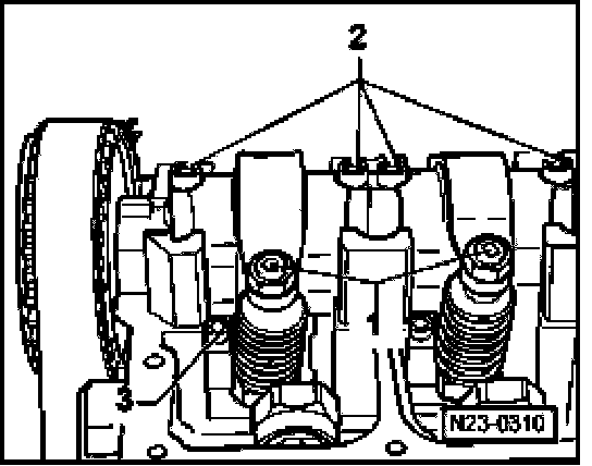 - Loosen bolts - 2 - for rocker lever shaft from outside toward inside, using socket insert 3410 and remove rocker lever shaft.