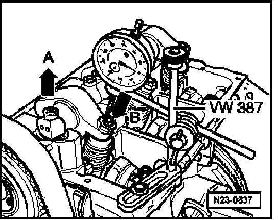 - Turn crankshaft in engine running direction until roller of rocker lever is positioned on tip of cam lobe. Roller side - arrow A - is positioned at highest point, dial gauge - arrow B - is positioned at lowest point.