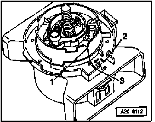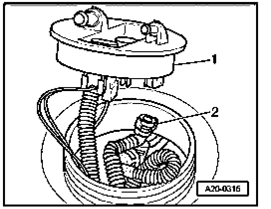 - Insert fuel pump into baffle housing in fuel tank so that notch - 1 - at fuel pump aligns with marking - 2 - at baffle housing.