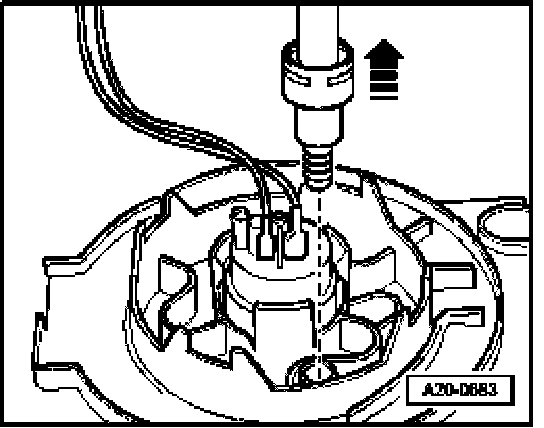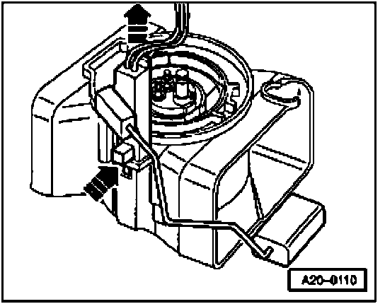 - While pressing retaining tab, pull out Sender for fuel gauge -G- from baffle housing in fuel tank - arrows -.
