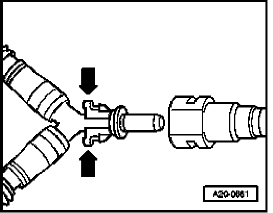 - Push fuel hose onto Y-fitting and push together until retaining tabs - arrows - engage.