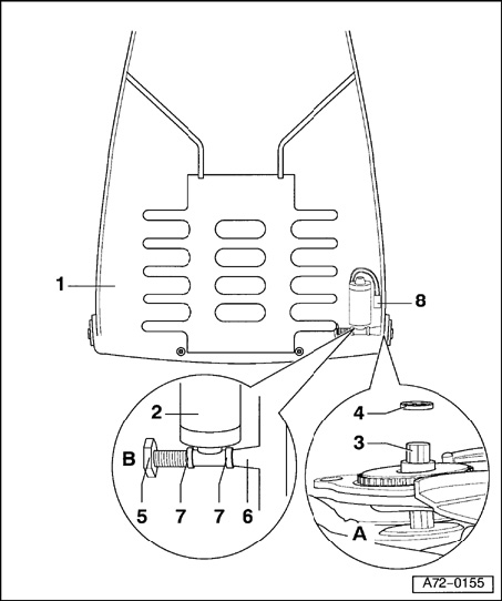 - Unthread bolt - 5 - out of threaded bushing - 6 - and remove plastic washers - 7 - and backrest motor - 2 - out of backrest frame - 1 - - (see magnified area B) -.