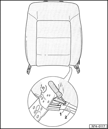 - Pull tension wires - 1 - out of backrest frame - 2 -.