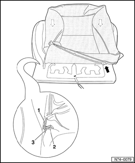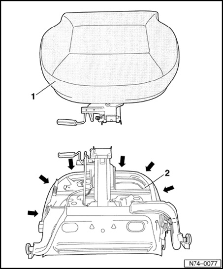 - Pull off cover - 1 - from seat frame - 2 - - arrows -.