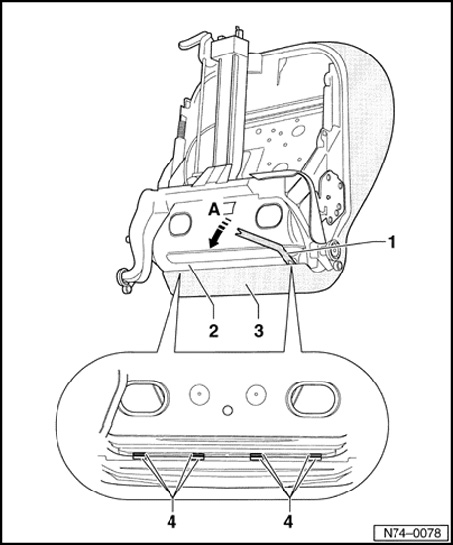 - Guide Pry Lever - Rmv Outside Mirror 80-200 - 1 - between seat frame - 2 - and cover - 3 - and press apart locking lugs - 4 - - arrow A -.