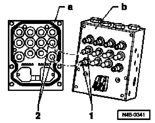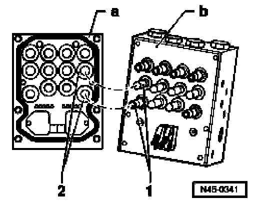 When attaching control module -a- and hydraulic unit -b-, be sure that valve domes -1- of the hydraulic unit do not jam with magnetic coils -2- of the control module.